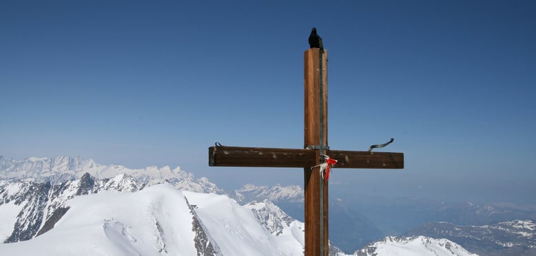 Zuoberst ist die Aussicht am besten, das denkt sich sicher auch diese Dohle auf dem Gipfelkreuz des Sustenhorn.